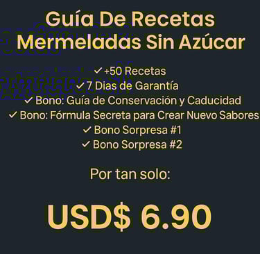 Con nuestra Guía de Recetas de Mermeladas Sin Azúcar, tendrás un material exclusivo con más de 50 recetas irresistibles, llenas de sabor, 100% saludables y tan fáciles que te sorprenderán. Perfectas para cuidar tu alimentación sin renunciar al placer dulce.